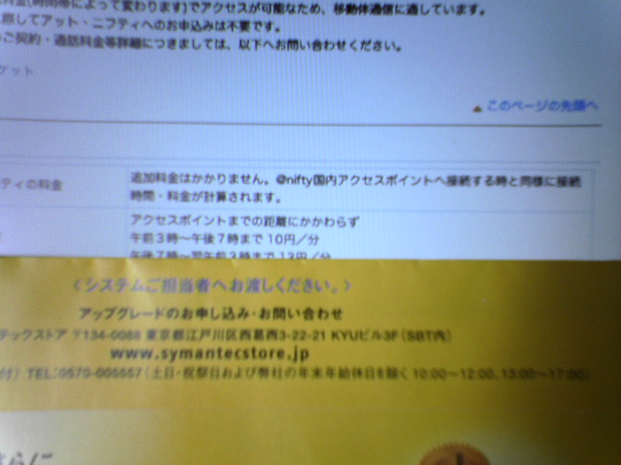 拙者は接写に期待していたので(+_+;;)\バキ!!,撮ってみました。手前の黄色背景が封筒の文字で,その後ろの白背景はノートパソコンの画面。あまり近すぎるとダメみたいですね(写真は約7-8cmの距離から撮影)。両端が歪むのは何故?(レンズの方向が悪いのでしょうか)。